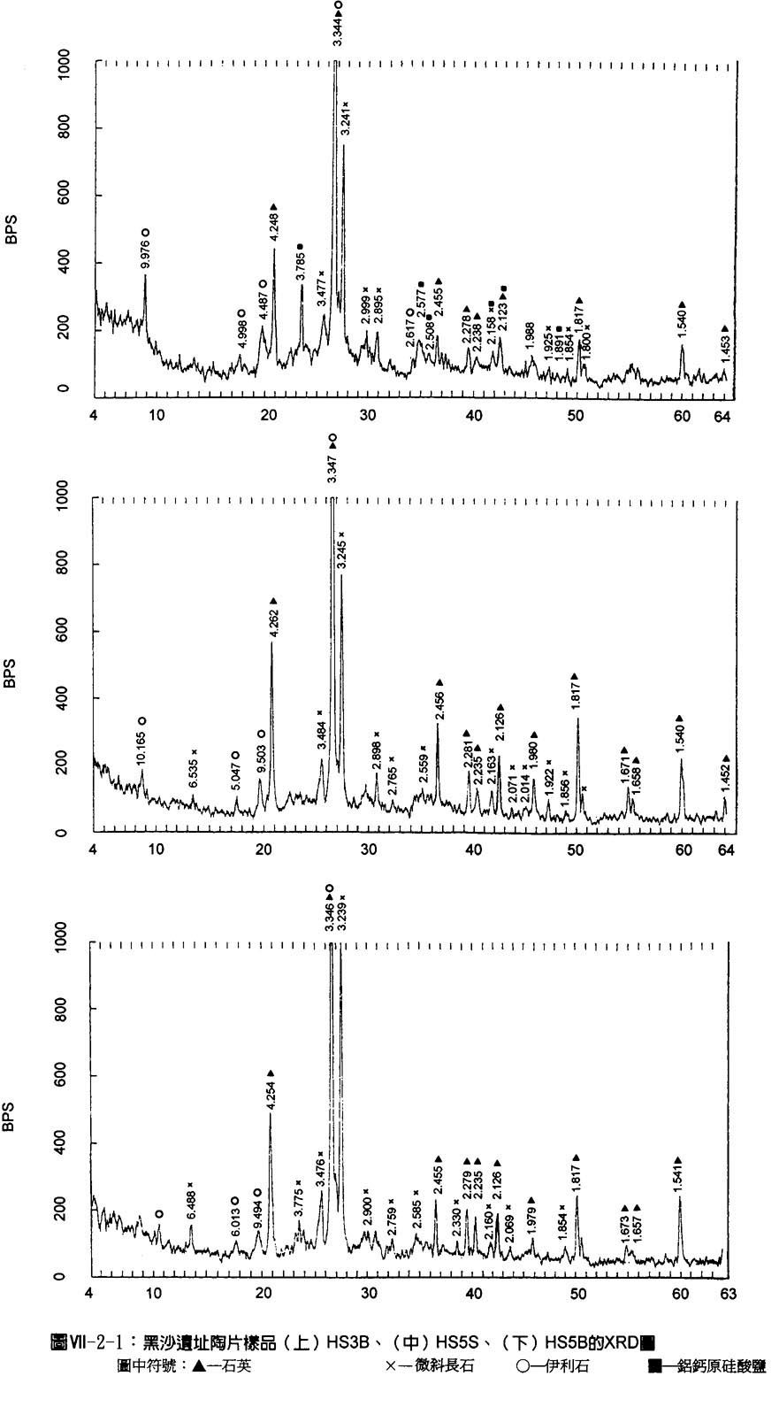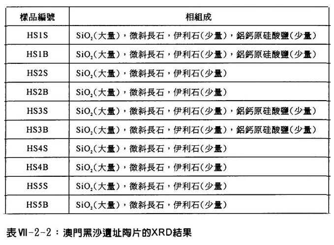 表Ⅶ-2-2列出澳門黑沙遺址陶片的XRD結果。