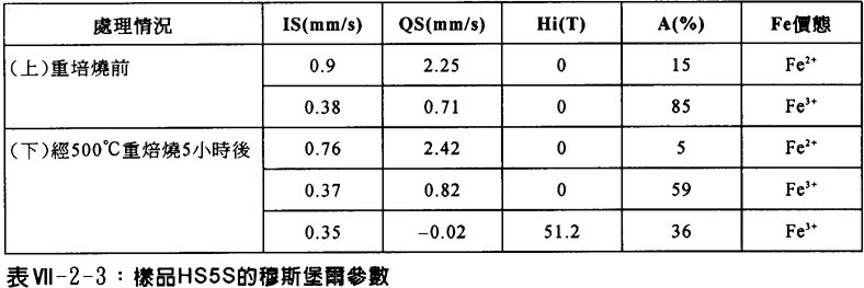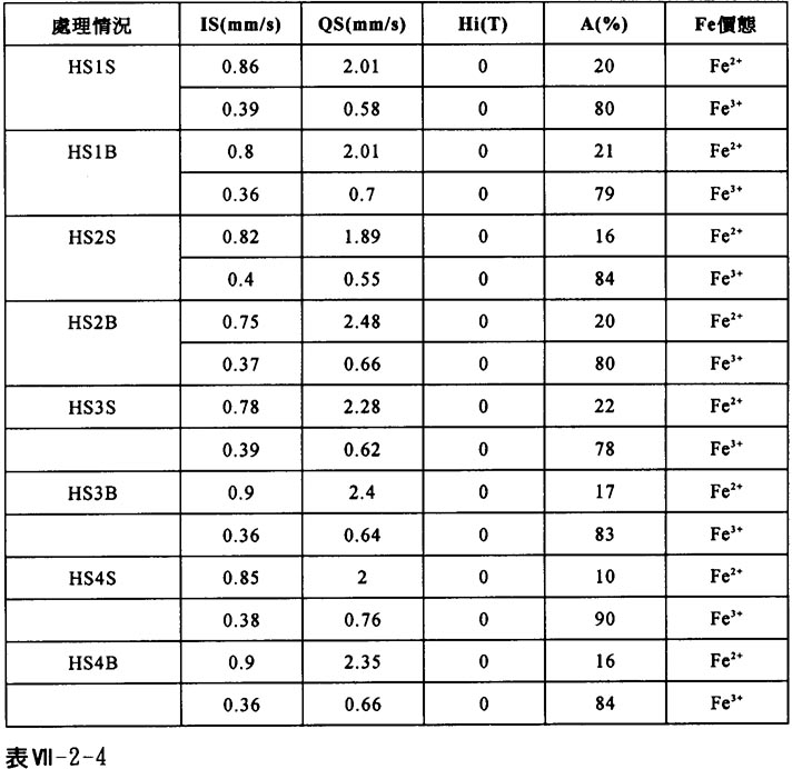 表Ⅶ-2-4列出其餘八個樣品的室溫穆斯堡爾參數,可見這些古陶器都是在氧化氣氛中燒製的。
