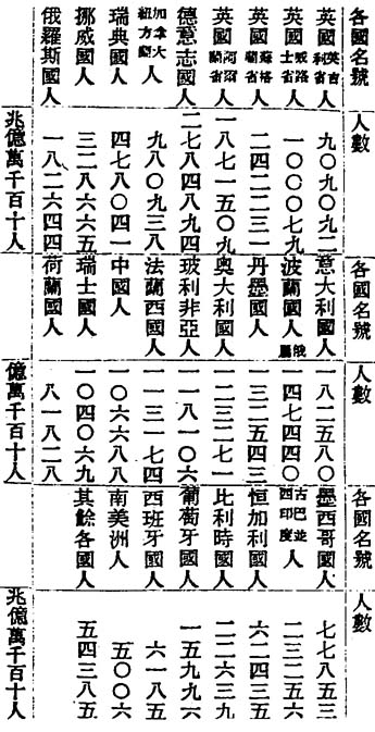 不及中國兩省,以彼例此,中國若有鐵路,不每省每年省脚價銀二百四十兆兩乎, 凡言富國者,必先明生利分利之別,假如有地十方里,每年土產約値銀十萬兩,約需一千人已克集事,然則每人之所得,計有銀百兩矣,然而此十方里地中,倘需增出一千人,亦藉之以餬口,惟其所操之法,無異於昔時,則人雖增而土産不增,其用力之處,既已抛荒一半,及至收穫之際,每人所得,僅有銀五十兩耳,是謂分利法,假此增此一千人,而能各創新法,務令原地十方里中所出土産,可增一倍,則至年終,分其收穫之數,每人仍皆可得銀百兩,豈不甚妙,又使此十方里地中,增新法而並不增人,則除原可得銀百兩之外必又增銀百兩豈不更妙,是謂生利法,故夫機器輪船鐵路諸新法,皆爲生利之用者也,中國人士,不明此理,是以疑而阻撓之,甘受分利之害,坐令地產不出,而致以人滿爲患,即如北省之貨,四人所作,而六人運之,論者莫不疑鐵路既開,運力蠲省,十人中必有六人乏食者,不知新法未出,人數早溢於物產之數,其用力之處,早已拋荒十之七八,且既無善運之法,非藉多人之力,不能運銷所出之物,故人皆無餘力,以從事於出産之物,即有餘力以從事於出產之物,令其增多,亦苦更無餘力以运銷其增多之出産,故咸因陋就簡,視爲固然,貧瘠之根,即在於是,必明此理,方可與言一切新法,不獨鐵路爲然也。 未完南皮先生 賜寿記