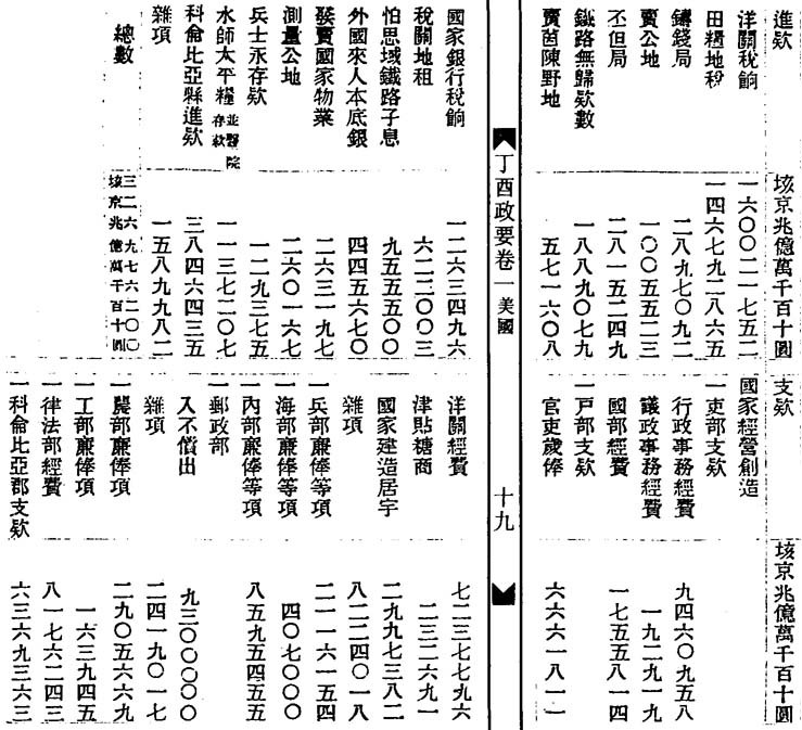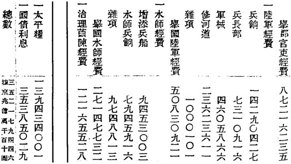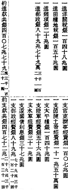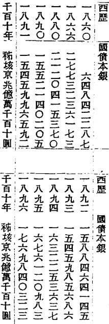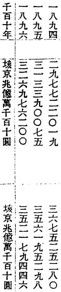 畜牧田園農具機器 三一穰九秭五垓四京四兆五億四萬四千三百三十三圓 屋宇屋地 二秭○三京○一億五萬○四百圓 五金礦山 一秭二垓九京一兆二億九萬一千五百七十九圓 金銀通寳金磗銀磗 一秭一垓五京八兆七億七萬四千九百四十八圓 機器工廠生材熟料 三秭○五京八兆五億九萬三千四百四十一圓 鐵路產業街車鐵路在内 八秭六垓八京五兆四億○七千三百二十三圓 電線德律風船雙 七秭○一兆七億五萬五千○一十二圓 |