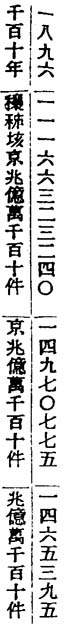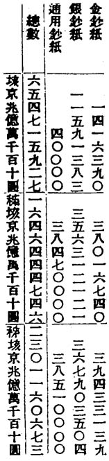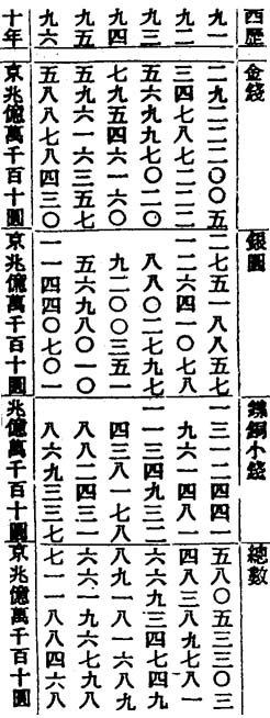 一千八百九十五年七月一号,至九十六年六月三十号,邮政局发出汇銀單,在國內交易者,二十三兆九十六萬二千零五十三紙,值银一百七十二兆一亿零零六百四十九圆,与外國交易者,九十八万五千七百九十九紙,值银一十三兆八億五万二千六百一十五圓,共发出二十四兆九亿四萬七千八百五十二紙,值银一百八十五兆九亿五萬三千二百六十四圆,一千八百九十六年,查得举国信馆七萬零三百六十所,九十五牛七月一號,至九十六年六月三十号,共支郵费九十兆六亿二萬六千二百九十六圓八角四分,共進银八十二兆四亿九萬九千二百零八圓四角,除進支過银八百一十二萬七千零八十八圓四角四分,