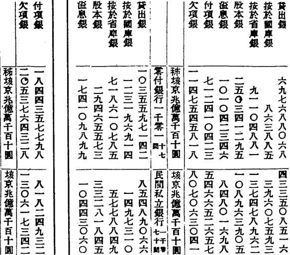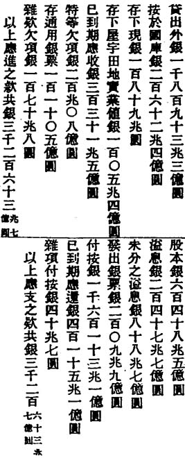 查美国国家银行共有三千六百七十六閒,皆繳银按於国庫,而後发银票,所發银票,比按银之數略多,其按银,国家仍如数偿其利息,统查国家银行,共按银二百六十二兆四亿圆,