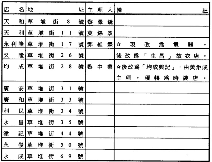 當作者到草街進行訪問時,發現很多商店仍留有昔日經營故衣店的痕跡:例如在草堆街,現爲一家玻璃鏡畫的三昌泰記,在其門牌上仍依稀看到昔日是故衣店的招牌字樣;又如現爲電器舖的陸記和永利(亦即永利隆,即使以前永利隆是故衣店的時候,行家一般也只是稱爲「永利」的),以及現轉行爲時裝的均成興記,雖然現在已不是故衣店了,可是店名也沒有改變。據知這些商店的老闆只是轉了業,一些則留給其子孫繼續經營。另外更有些是「改頭不換面」的,有一間店鋪的門牌寫著的明明是現在店舖的名字,但鐵閘上仍然是以前的故衣店名字——添記。但無論如何,澳門現在已沒有故衣店了,只知道鄰埠香港還有少數的故衣店仍在掙扎著。