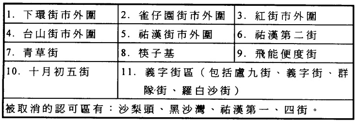 ┌──────┬──────┬───────┬──────┐│1.下環街市│2.紅街市 │3.營地街市 │4.祐漢街市│├──────┼──────┼───────┼──────┤│5.水上街市│6.台山街市│7.雀仔園街市│ │└──────┴──────┴───────┴──────┘