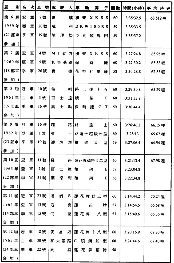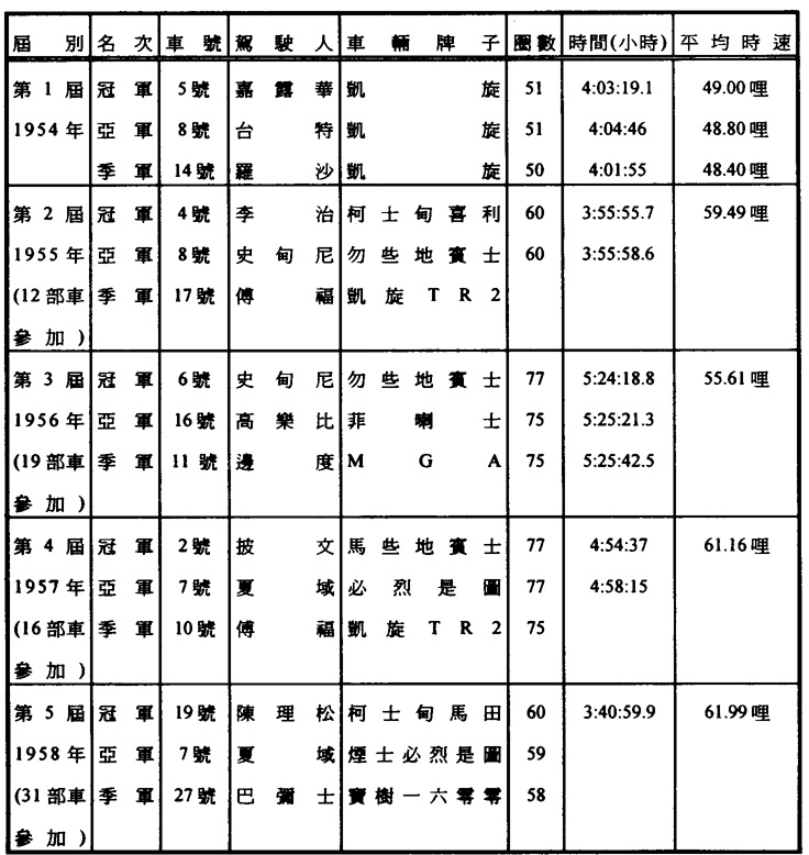 【註二】第四屆(1957)大賽車的賽道有了重大改善,由漁翁街發電廠至水塘角一段彎路改爲直路,因此跑道全長由三點九哩縮減爲三點八哩,全部路面改鋪了三合土或瀝青。