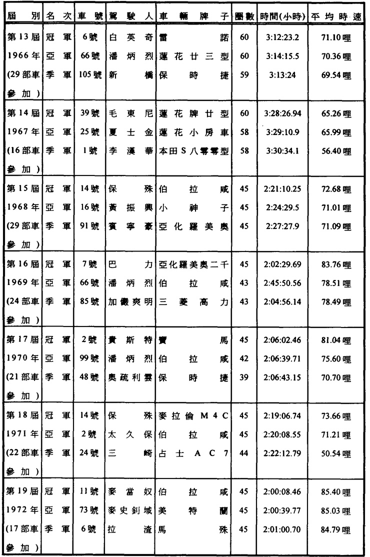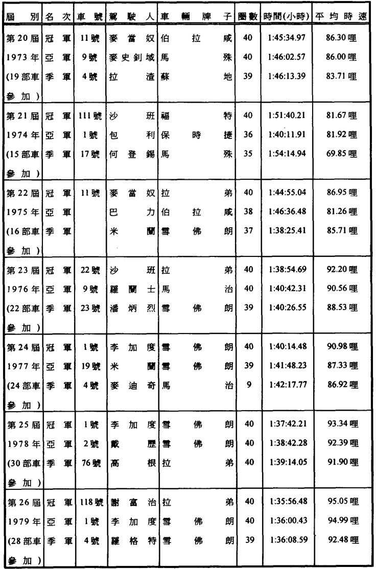 【註一】澳門格蘭披治大賽車,從一九五四年起,一直是每屆連續舉行兩天,但有兩次例外。其一是於一九六九年(第十六屆),當年的比賽共分爲三次四天舉行。五月十八日的「東望洋一百零一圈」長途賽、十一月十五日及十六日的汽車比賽,包括格蘭披治大賽、以及十二月七日的電單車賽。另一次是一九七三年(第二十屆),由十一月十六日至十八日,是紀念二十周年之舉。