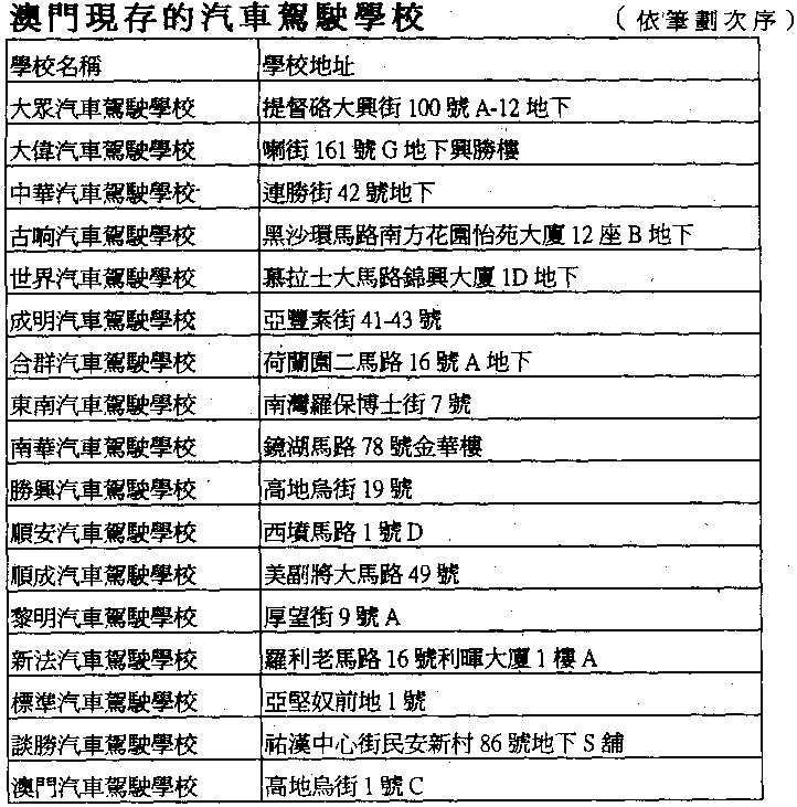自七十年代初,澳門人口一直穩定地增加,隨着社會經濟的發展。車輛已成爲本澳的主要交通運輸工具,擁有私家車代步的市民不斷增加,所以,駕駛執照的需求量亦隨之而上升。令本澳汽車駕駛學校均其門若市,數目更由三、四間急速增加至十多間。儘管如此,現時教車業的競爭仍未算激烈。因爲政府在十多年前已開始停發「師傅牌」,限制了教車業人仕的數目,而澳門教車業商會亦把會員學校的教學收費統一,令同業之間的競爭大大減少。