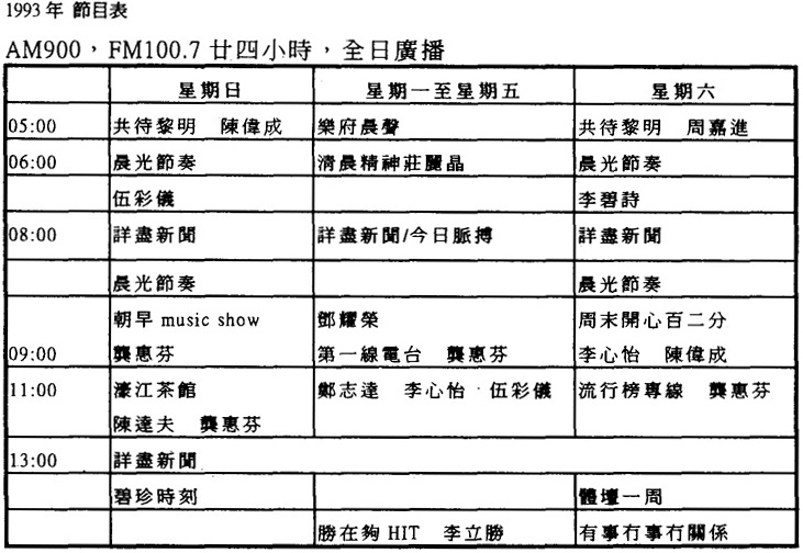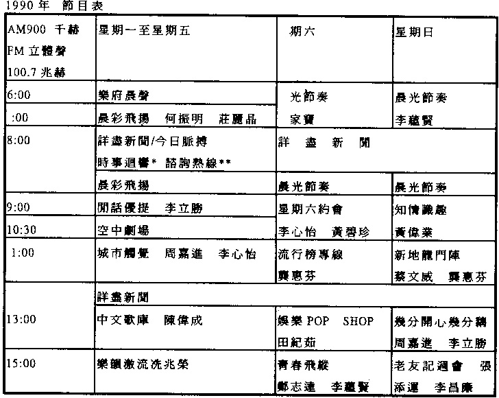 90年:電台節目已趨向諮詢、時事及資訊的路線,由「今日脈搏」中增設諮詢熱線。而「空中劇場」亦是電台最後一個廣播劇,可見電台由以廣播劇和音樂爲主,以遂漸轉變到與聽眾在空中直接溝通及社會資訊等方面的節目。