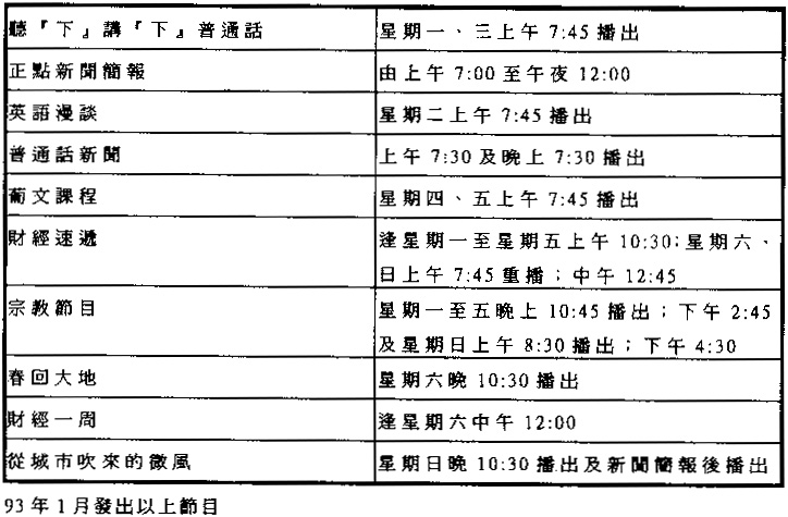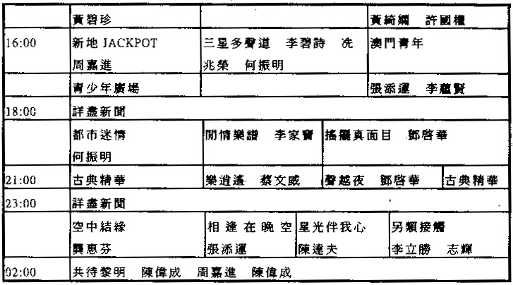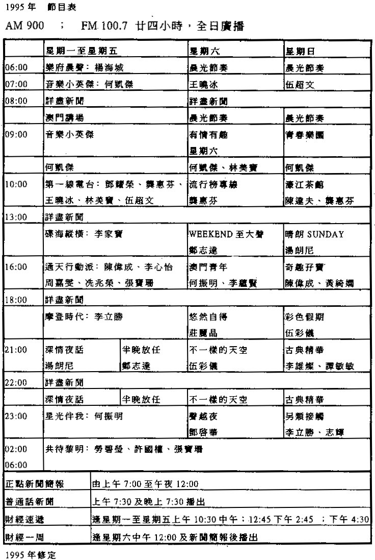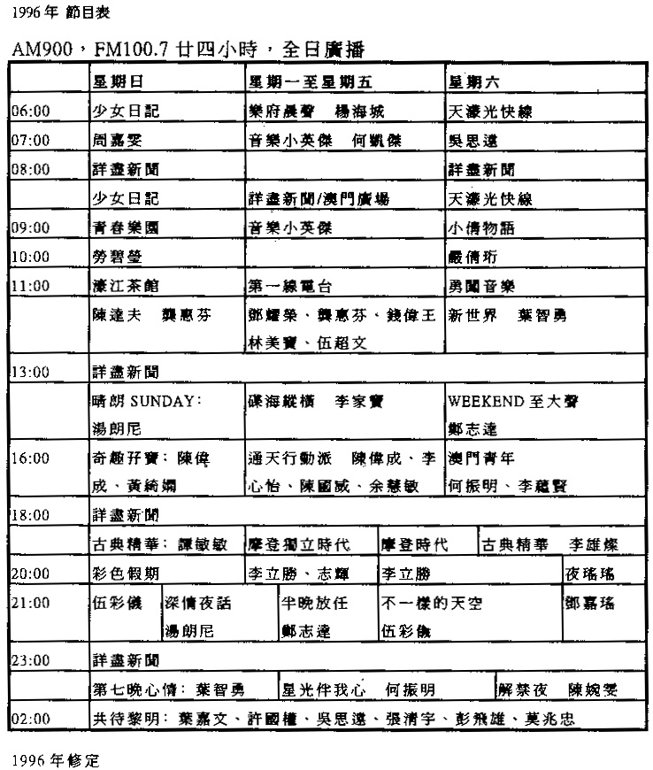96年:電台的節目可說是式式具備,多元化,例如:(通天行動派)(奇趣孖寶)均是一些DJ 與聽眾玩遊戲拿獎品的活潑性節目;「濠江茶館」「第一線電台」則是一些淸談節目,話題主要是圍繞時事與社會問題的探討,逢星期五的「星光伴我心」就是很受聽眾喜愛的訴心聲節目,所以電台正走向雜誌化路線。