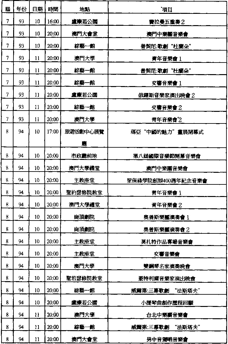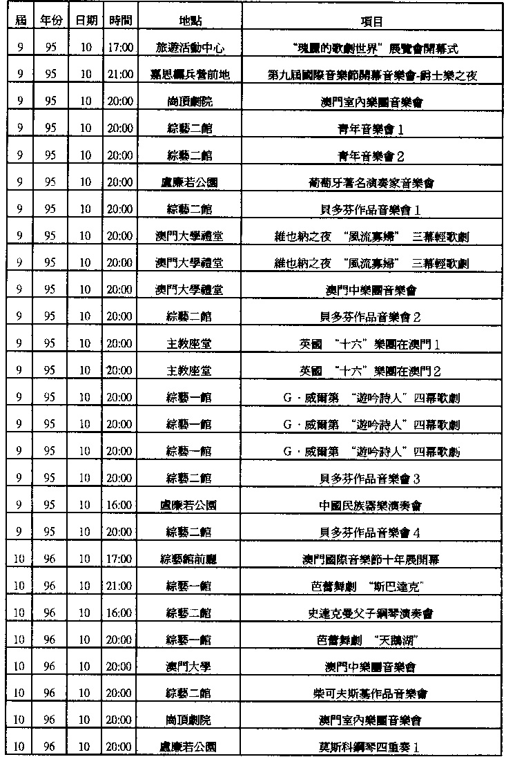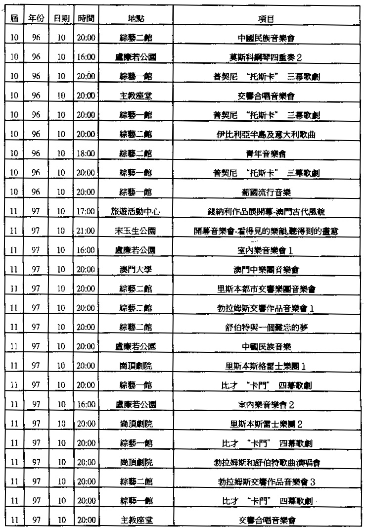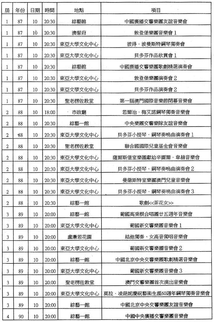 ┌──┬────────────────────┐ │次數│場地 │ ├──┼────────────────────┤ │31 │盧廉若公園 │ ├──┼────────────────────┤ │28 │東亞大學文化中心(澳門大學) │ ├──┼────────────────────┤ │22 │綜藝一館 │ ├──┼────────────────────┤ │16 │綜藝二館 │ ├──┼────────────────────┤ │7 │崗頂劇院 │ ├──┼────────────────────┤ │6 │主教座堂 │ ├──┼────────────────────┤ │5 │聖老楞佐教堂、市政廳 │ ├──┼────────────────────┤ │4 │聖若瑟修道院教堂 │ ├──┼────────────────────┤ │3 │澳門大會堂、澳門旅遊活動中心展覽廳 │ ├──┼────────────────────┤ │2 │大炮台 │ ├──┼────────────────────┤ │ │綜藝館前廳、澳督府、市政廳展覽廳、市政廳│ │ │前地、南灣海濱、大三巴牌坊、宋玉生公園 │ └──┴────────────────────┘