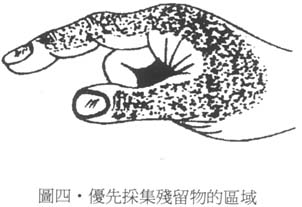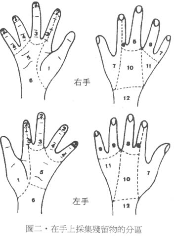 為了解答這些疑問,某些司法科學家7與一些志願人仕進行實驗,把人的手分成多個區域(如圖二),並得出以下結論。
