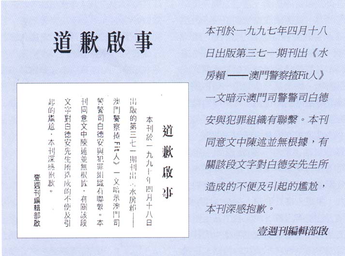 "華僑報"亦獲悉該道歉啟事,刊登了一篇以《水房賴 - 澳門警察 Fit人》為標題的文章,說明香港"壹週刊"於本月十七日刊登了向司法警察司司長白德安的道歉啟事,指出有關文章暗示司長與犯罪組織有聯繫是毫無根據的。