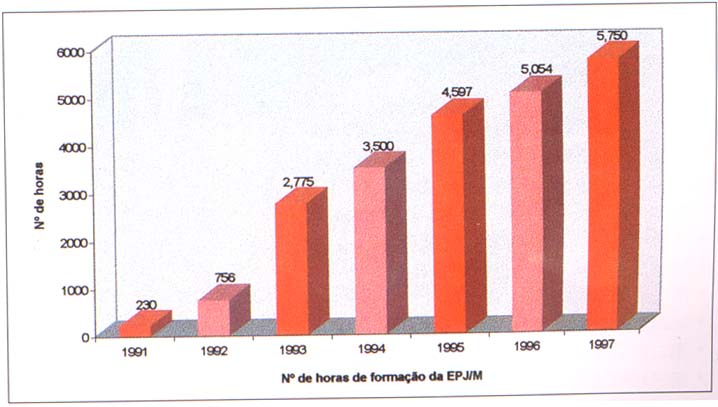 我們可以留意到,近幾年來司警學校的職業培訓與語言培訓,兩者在總培訓工作所佔的比重相若。在培訓時數方面,兩者各佔總時數的百分之五十。而在總培訓時數方面,已有平穩的增長。事實上,從中可以體現出有關部門除遵守第47/GM/94號批示的規定外,亦相當重視要取得職業培訓與語言培訓兩者的不衡。