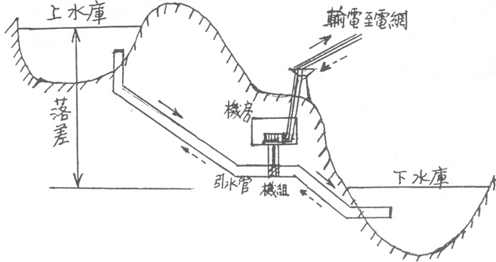 在電網用電低谷時,則將發電機組改變爲抽水機組,利用電網的富餘電力,將下水庫部份水量通過引水管道倒流抽回上水庫,將富餘電能轉換爲重力位能,儲蓄於上水庫内備用。