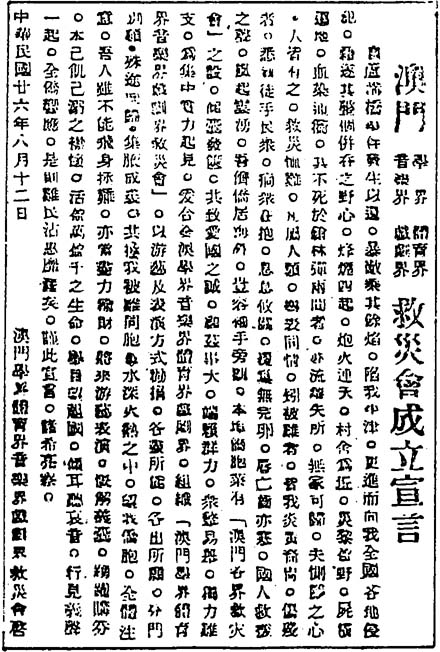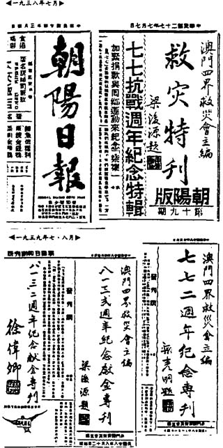 在此期間,廣大澳門人心懷祖國,不忘抗日救國。許多愛國同胞,包括教師、學生、工人等,都紛紛投身抗日救國的行列中,一呼百應。以讀書會、劇社、音樂社、歌詠團等形式組成很多殊途同歸的愛國社團,當時比較活躍的青年愛國社團有:文化協會、前鋒劇社、起來劇社……雖自“蘆溝橋事變”發生後,澳門之愛國社團便陸續組織起來。在國內抗戰高潮,各界推動下,澳門愛國青年和愛國社團才集中力量。於是,繼澳門工商界和上層人士組織“澳門各界救災會”和國民政府在灣仔建立“澳門各界抗敵後援會”後,澳門《朝陽日報》和《大眾報》也聯合發起組織“澳門學術界、音樂界、體育界、戲劇界救災會”簡稱(澳門四界救災會),由於當時葡萄牙當局標榜“中立”,不許澳門愛國社團公開使用“抗日”“抗戰”“救國”一類字眼,因此只得用“救災”名義,以便展開工作,而所救的“災”,實際上是民族的災,國家的難,對此,當時的愛國同胞都心照不宣。