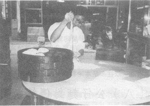 4.製成的一條一條麵條,由有經驗的師父把它用手搓成一個個的麵餅,放在蒸籠內加以鑊蓋蓋著,約十到十五分鐘的時間,取出,待之冷卻。