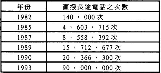 1993年直撥電話9,000,0000次,平均每年打長途電話219.5次,比1990 年增長3.42倍。
