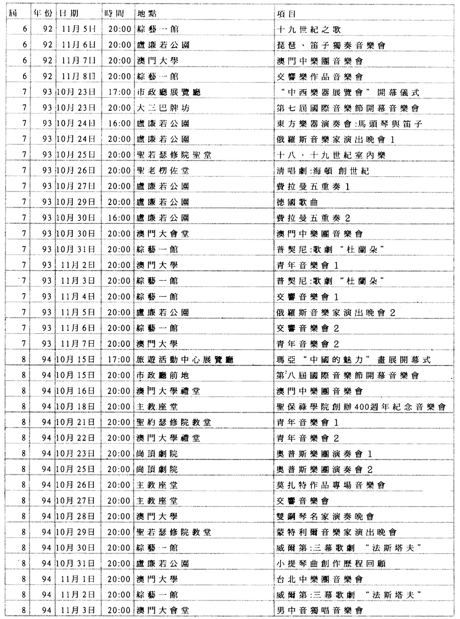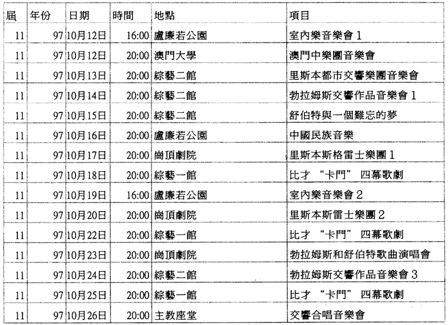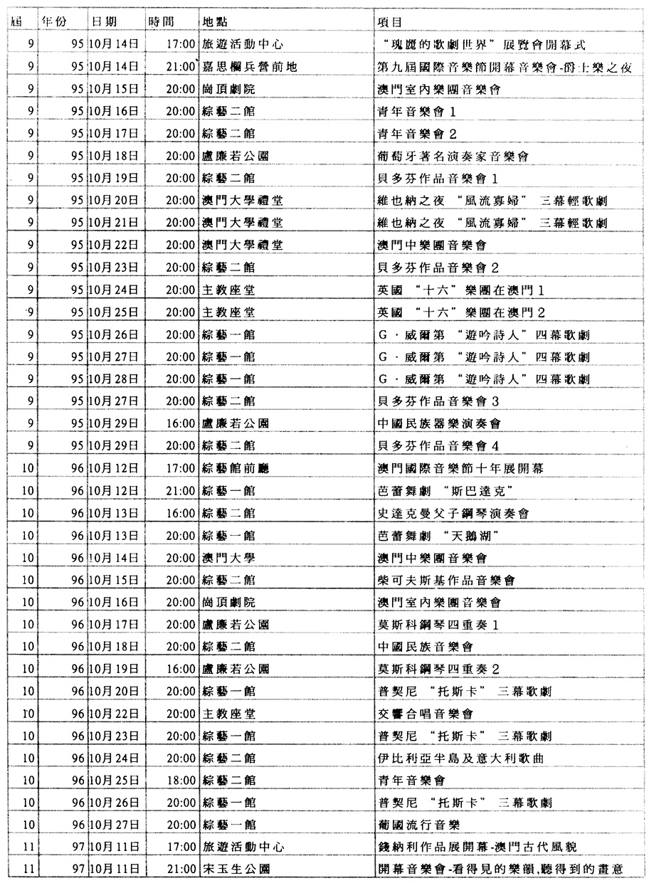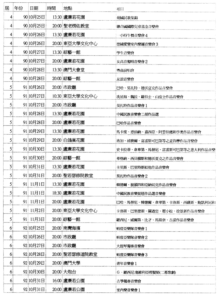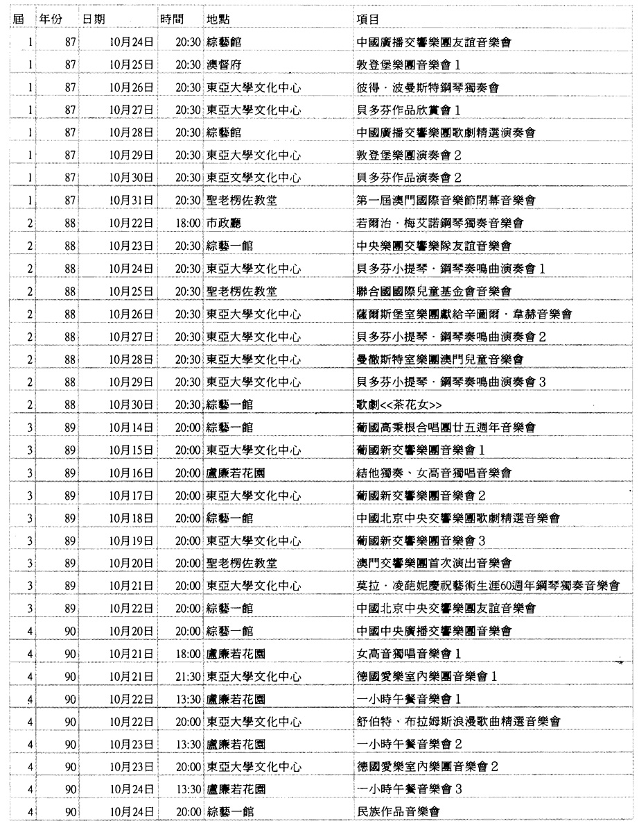 ┌────┬──┬───────┬────────┐ │届數 │年份│日期 │主辦單位 │ ├────┼──┼───────┼────────┤ │第一届 │1987│24/1O~31/10│文化學會* │ ├────┼──┼───────┼────────┤ │第二届 │1988│22/1O~3O/10│旅遊司 │ ├────┼──┼───────┼────────┤ │第三届 │1989│14/10~22/10 │旅遊司 │ ├────┼──┼───────┼────────┤ │第四届 │1990│20/10~28/10│旅遊司 │ ├────┼──┼───────┼────────┤ │第五届 │1991│26/10~3/11 │文化司署 │ ├────┼──┼───────┼────────┤ │第六届 │1992│25/10~8/ll │文化司署 │ ├────┼──┼───────┼────────┤ │第七届 │1993│23/10~7/11 │文化司署 │ ├────┼──┼───────┼────────┤ │第八届 │1994│15/10~3/11 │文化司署 │ ├────┼──┼───────┼────────┤ │第九届 │1995│14/10~29/10│文化司署 │ ├────┼──┼───────┼────────┤ │第十届 │1996│12/10~27/10│文化司署 │ ├────┼──┼───────┼────────┤ │第十一届│1997│11/10~26/10│文化司署 │ ├────┼──┼───────┼────────┤ │第十二届│1998│24/10~8/11 │文化司署 │ ├────┴──┴───────┴────────┤ │*備註:實務工作由文化學會負責,資金由旅遊司提供 │ └────────────────────────┘