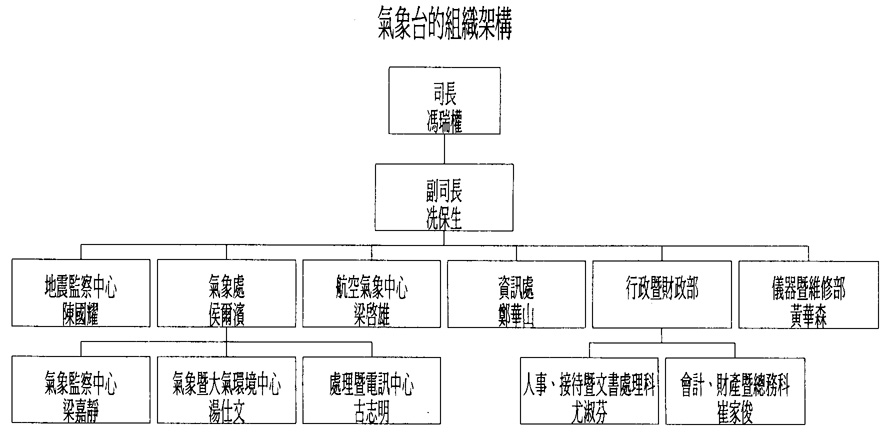 目前的澳門地球物理暨氣象台共分氣象科、空氣質量監察、地球物理、預測科、電腦部、電子部和行政部七個部門,由一位司長和一位副司長負責管理,在其之下設有:三個處長,分別為氣象處、資訊處和儀器暨維修處;航空氣象中心主任,其職務亦相當於處長和二位組長職級的主任,分別為地震監察中心和行政暨財政部。在氣象處之下,設有三個中心,分別為氣象監察中心,氣候暨大氣環境中心和處理暨電訊中心。