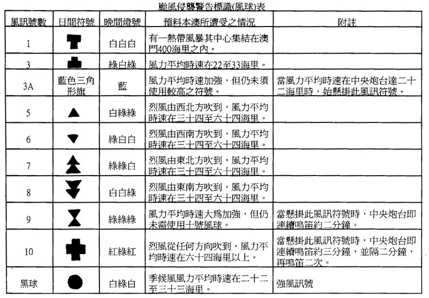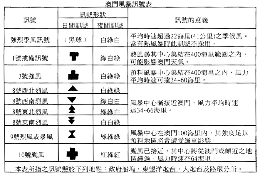 1.凡示颱風標識,不論日間或夜間均懸於港務局、東望洋炮台、中央炮台、望炮台、路環及氹仔港務分局處,並一律依照本表之規定。