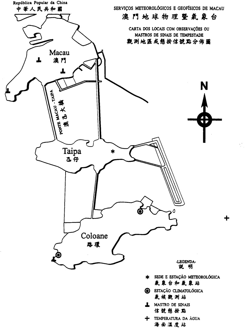 天文暨地理廳與天文氣象台,本隸屬于港務廳,1950年澳門政府鑑於天文台的重要性,據第2042號法令脫離了港務廳成爲獨立的機關,再據38041號法令,規定天文局的地位。1980年改組升格爲天文暨地球物理廳,當時的局長由葡國國立天文局委任。其職責是處理澳門一切與氣象及地球物理有關的事務,如資料收集、分析、繪圖、發報第三個部門等。氣象颶風、天氣和本澳附近各地的天文台取得聯繫。除了上述的職責之外,還要注意天氣風訊變化,並報告標準時間,每隔三小時亮燈一次。