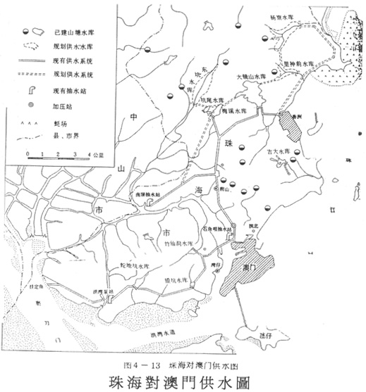 珠海在西江水淡時,從磨刀門汲水,當鹹度大時,則將珠海的竹仙洞、南屏、銀坑、蛇地坑四個水庫的儲水輸澳、據統計珠海水庫庫容總量逾一千多萬立方米,足可向澳門作三個月的正常供水。澳門方面的水庫庫容總量亦有二百多萬立方米,可供應全澳半個多月的用水,從以上的數字看兩地的需水量相當巨大,如在正常天氣情況下絕不成問題,但遇長期天旱不下雨,單依賴珠海市的供應是有困難的。現今海和澳門同時經濟發展,故水庫集水面積應擴大,水源應向上爭取,減少海潮影響,隨時汲抽大量西江淡水。