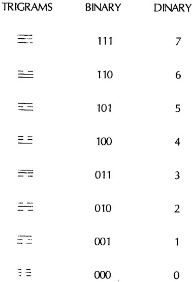 When le Gobien shared this with Leibniz he realized at once the great similarity between the system of binary arithmetic he had to develop in 1679 and the I Ching symbols of Yin, Yang, trigrams and hexagrams. A correspondence immediately arose between Leibniz and Bouvet regarding the I Ching and binary notation. In April 1701 Leibniz sent Bouvet a table of binary numbers. He received a reply in November in which Bouvet had worked out two alternative arrangements of the 64 hexagrams based on Shao Yung’s Circular Diagrams which could serve to symbolize binary progression. Within two years Leibniz published an extensive article on binary notation in the Memoires de 1’ Academie Royale des Sciences (1703) entitled “De Progressione Dyadica: Explication of Binary Arithmetic which is constituted solely of the characters 0 and 1, with remarks concerning their utility and concerning the way in which they reveal the meaning of the ancient Chinese figures of Fu Hsi”. The explication of the latter remark is done in terms of the Pa Kua, or “eight trigrams”. Leibniz correlation of trigrams, binary numbers, and dinary numbers is here given in chart form: