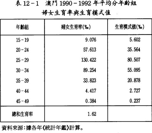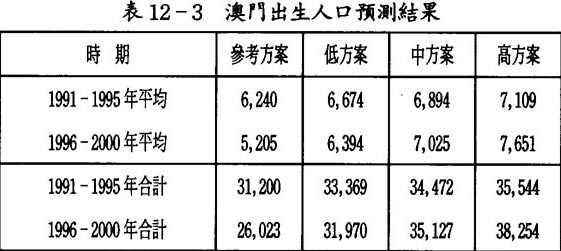 未來的育齡婦女人口是用分年齡層遞推方法求出。例如,用1990年年末15-19歲年齡組育齡婦女人數加上五年內機械增長人數再減去五年內死亡人數,便得到1995年年末20-24歲年齡組的育齡婦女人數。算出育齡婦女七個年齡組的人數後,它們的總和就是育齡婦女總人數。上一期期末與本期期末育齡婦女人數的幾何平均値就是本期期中的育齡婦女人數。澳門育齡婦女預測結果見表12-2。