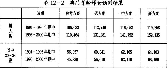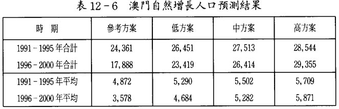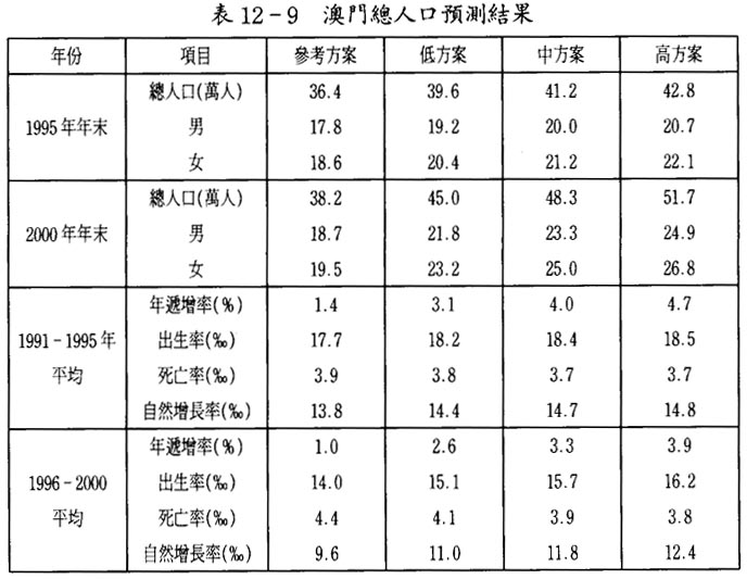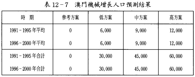 考慮到這些情况,本預測提出了三個方案:高方案是到公元2000年平均每年機械增長人口爲12,000人,中方案爲9,000,低方案爲6,000人;其中的中國內地合法移民,各個方案均爲1,500人。同時,爲了比較,還計算了一個機械增長人口爲零的參考方案。澳門機械增長人口預測結果見表12-7。