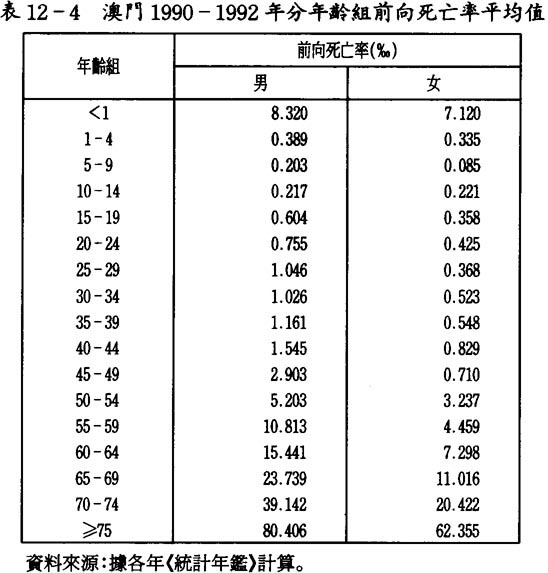 死亡人口的數量是主要與總人口的多少及死亡率的高低有關。用分年齡層遞推方法進行人口預測時,死亡率的計算稍有不同。這種預測方法是用前一時期期末的總人口來遞推,所以死亡率應當用本年死亡人數除以上年年末總人口(稱爲前向死亡率),而不是像一般人口分析時用本年平均人口來除。本書前面的分析表明,澳門人口的死亡率較低,估計未來十年內再難以繼續大幅度下降,因此,本預測採用澳門1990至1992年平均的分年齡層前向死亡率(見表12-4)。