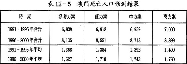 澳門死亡人口預測結果見表12-5。從表中清楚看出,機械增長對死亡人口的影響不如對出生人口的影響那麼大。這是由於機械增長人口比例較大的靑壯年部份死亡率很小的原故。1996年至2000年死亡人口有較大增加,則是因爲總人口比較多。