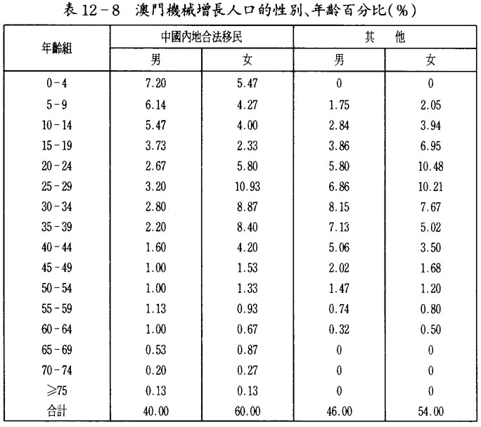至於機械增長人口的性別、年齡百分比,則分兩部份考慮。中國內地合法移民不少是來澳門與家人團聚的中青年婦女和少年兒童,而外地勞工、獲准居留之外籍人士及中國內地非法移民則多數是青壯年,少年兒童和老年人甚少。本預測機械增長人口性別、年齡百分比(表12-8)是根據1990年至1993年中國內地合法移民性別、年齡分佈②及1981至1991年澳門機械增長人口性別、年齡分佈③稍加調整而定出的。