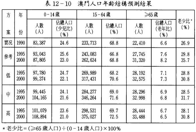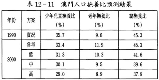 從表12-10還可看出,假如澳門人口沒有機械增長,到2000年就已經完全進入老年型社會(參考方案的三個指標全部符合老年型標準)。由於機械增長人口大部份是成年人,特別是靑壯年,因此會減慢老年化的速度。
