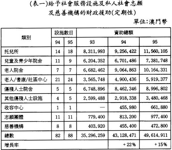 從表一知1994年給予私人服務機構的財政資助增長了22%,而1995年則增長了15%,從其增長幅度顯示了政府對這些服務設施的依賴和重視。