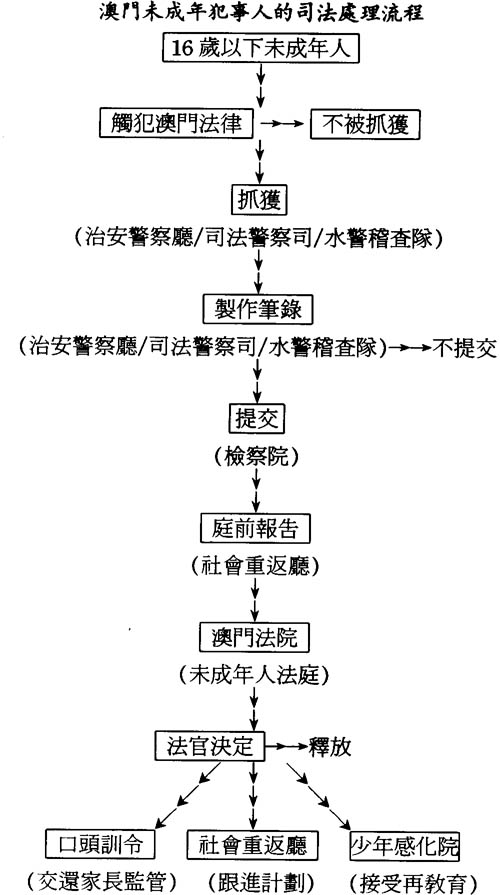 澳門目前的司法處遇模式主要以社會重返廳及少年感化院爲主。社會重返廳的制度包括對成年及未成刑案疑人的背景及行爲作調查,撰寫庭前報告,作爲法院法官進行法庭審訊及訊問之參照;社會重返廳也會執行法官之判決及決定,跟進成年及未成犯事人的處遇方案。自1992年起,社會重返廳開始執行直接由未成年人法庭法官所決定交來跟進的未成年犯事人個案,爲他們設計一套預防青少年犯罪計劃程序,帶引他們重返社會。