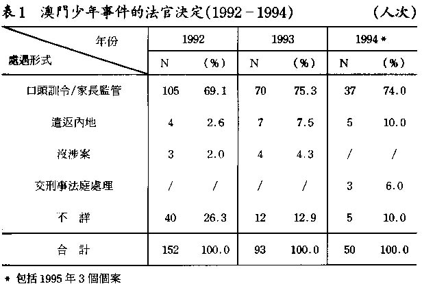 由於以上理由,筆者曾於1992年、1995年及1998年三度到澳門法院翻查1989年至1998年少年法庭所處理的少年事件,發現十年間澳門青少年犯事情況有年輕化、女性化、嚴重化及團幫化的趨勢。年輕化指青少年犯罪的年齡由1989至1993年的平均最多是15歲時犯事,降至1994至1998年平均最多是14歲時犯罪,而其次多犯罪時的年齡也從1994年的15歲降至1995至1998年的13歲,以上發現足見青少年犯罪的年齡明顯地有普遍下降之趨勢。