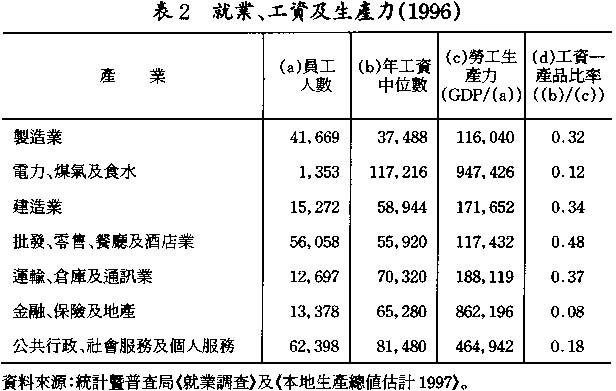 出口競爭能力,主要體現在產品的素質及價格方面。澳門以成衣商品及旅遊服務出口爲主,兩者均屬勞工密集型生產,其產品的出口競爭能力,因而大部分取決於員工的生產力或素質。但正如筆者在1999年發表的一篇論文中指出,提供澳門主要商品及服務出口的製造業及酒店業的勞工生產力在澳門各個主要行業中最低。②製造業及酒店業大量輸入外地勞工,使名義工資維持在偏低水平,但考慮員工生產效益因素的工資——產品比率則顯示這兩個行業的工人工資在低生產力的情况下實屬相對偏高(見表2)。舉例來說,金融、保險及地產業員工的平均生產力爲製造業員工的七倍,但其工資衹較製造業員工的工資高70%左右。