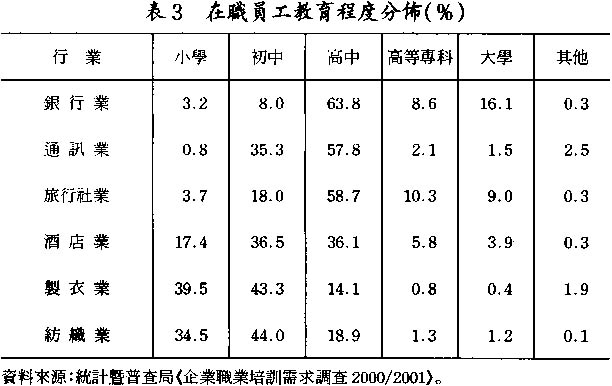 根據統計曁普查局出版的《企業職業培訓需求調查2000/2001》資料顯示,接受調查的216間製衣公司及37間酒店的職工敎育程度普遍偏低(見表3)。以製衣爲例,衹具初中程度或以下敎育程度的員工佔總數80%以上;而衹具初中程度或以下敎育程度的酒店員工亦佔總數一半以上。