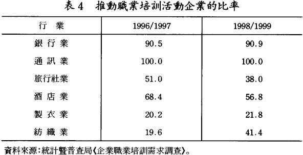 2.必須增強本地員工的職業培訓。官方調查顯示,製造業及酒店業公司大多對職業培訓持肯定態度,企業亦察覺到有提高員工生產力的需要,但在這兩個行業眞正落實推動職業培訓的企業相對較少(見表4)。主要原因相信是在現時經營困難的情况下,僱主對投資在人力資源上的取態較爲審愼,而在製造業内大多爲中小型企業,亦難以主動組織培訓。