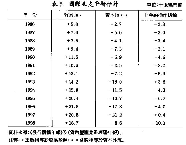 以澳門金融管理局(前貨幣曁匯兌監理署)的數字粗略估計,澳門的國際收支平衡(Balanceof Payments)資本賬淨額爲負値,顯示進入澳門的資金較流出澳門的資金少(見表5)。從有關本澳銀行體系的數據觀察,1998年銀行體系的對外負債爲662億澳門幣,對外資產卻達954億澳門幣,亦即澳門銀行體系共有292億澳門幣投放海外,爲當年私人機構投資總額的四倍。因此改善本澳投資環境不單着眼於引入外資,還需吸引一些投資外地的本地剩餘資金回流澳門。