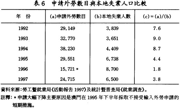 現時在澳門工作的外地勞工約有3萬人,佔本地勞動人口的15%左右。根據筆者在1999年9月及2000年1月發表的兩篇論文論證,本地失業工人的特徵實際符合外勞所佔有工作崗位的要求,本地工人有被外勞“排擠”(CrowdingOut)出勞工市場的跡象。同時外勞與本地工人存在明顯的工資差距,導致本澳的均衡工資水平下調,本地工人不能迅速接受較低的工資,遂使失業問題進一步惡化。