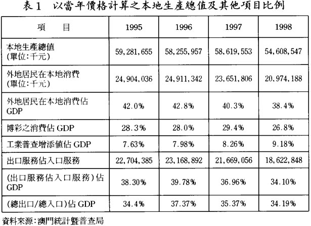 澳門經濟運作依靠其地理位置的優越,宏觀上,無論從任何角度去分析這個體系的操作特點,不能忽視其流出流入的觀測。澳門居民的每日消費品90%以上從區外輸入,而流出的衹有工業產品、出口服務、外地投資收益或外匯補貼的生活費用。若流出大於流入的缺口出現,而這個缺口的歷時過長,經濟環境惡化,甚而崩潰就不足爲奇。從表1的資料可初步反映流入遠遠大於流出,總出口(包括貨物及服務)大於總入口,整體對GDP的貢獻率長年高達30%以上,而外地居民在澳門的消費高達200億元以上,平均與本地生產總値(GDP)的比例爲40%,與香港的不足5%相比,澳門絕對是一個旅遊城市。出口服務與入口服務之差別約佔本地生產總値35%,優勝於香港在這方面不足10%的表現。號稱澳門第二大支柱的工業,產値約爲博彩消費的三分之一,且工業内聘請的外來勞工數量不少,對本地貢獻率不及博彩業。澳門政府的開支接近50%來源於專利稅的收入,無論從長遠的角度、經濟模式的發展定位,任何的分配模式、管治的理念都不能脫離事實根據和目前的現狀。澳門工業擁有的配額優惠將於2004年底隨世界貿易自由競爭的體制的演進而消失,而短期的高增値、具世界先進水平的生產系統進程未見突破,澳門地細人多、自然資源相對並不豐富,欠缺大力發展第一產業的條件,對旅遊業的依靠無疑大大側重,寄望賭博旅遊業的神速發展,增大澳門的收入,發揮經濟運作的乘數效應,擴大幅射範圍,使澳門經濟運作從新恢復活力。