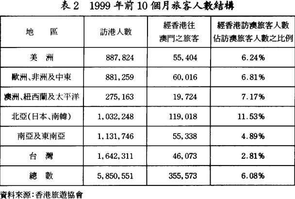 澳門號稱國際旅遊城市,1999年12月20日回歸後,變成中國特別行政區,香港、中國大陸和台灣的旅客來澳應改稱爲國內旅遊,而這三地的旅客人數佔澳門旅客人次90%以上,當然,由於澳門實行“一國兩制”,繼續稱之爲國際旅遊城市亦無可非議。香港來澳的旅客,特別是鍾情於賭博和夜生活人士,並不會由於增加賭牌而來澳突增。未來澳門旅遊業所爭取的對象,除中台兩地外,應擴展兩地以外的地區,根據表二的資料,吸納往港的外地旅客順道到澳門一遊,無論從短線或長線而言,均具可觀的客源潛在能力。