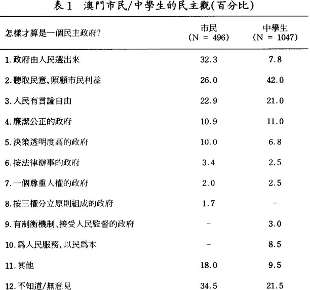 於1999年初舉行的一項電話訪問結果顯示,94%澳門市民心中的理想政治制度是民主政治,而75%認爲民主政治適合澳門①。換言之,嚮往民主,追求民主是澳門人的共識,這是令人鼓舞的。澳門新一代的民主價値取向是怎麼樣呢?他們對民主的了解有多少?與他們的長輩有甚麼分別?
