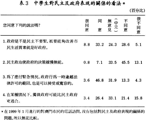 表3顯示,42%接受問卷調查的中學生同意或很同意“政府是不是民主不要緊要,衹要能改善市民生活質素就是好政府”;而衹有33.7%表示不同意或很不同意上述說法。反映出本澳中學生仍深受中國傳統文化的影響,衹期望一個萬能政府去照顧、改善人民的生活,而忽略了民主程序的重要性。令人稍感安慰的是,接近六成的中學生不同意或很不同意“民主政治使政府的決策緩慢無能”這個說法。