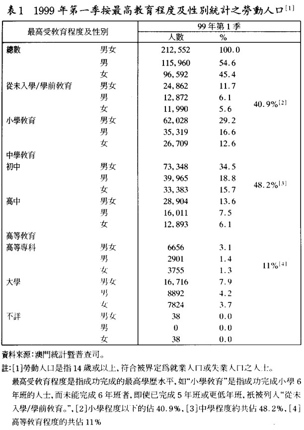 首先,掃除青壯年文盲工作是敎育行政的空白。從表1中可以看到,從未入學或衹完成學前敎育的,在1999年第一季勞動人口中,有24,862人,佔勞動人口11.7%。還有數以萬計的文盲被摒棄於勞動人口之外。這一問題應引起社會足夠重視,人口文化素質低不但是經濟發展和社會文明的一股阻力,而且根據外地數據,文盲家庭子女犯罪率高、敎育成功率低,對社會秩序、環境保護、公共衛生、文化敎育等都具有較多消極作用。澳葡政府一貫未有對策,作爲特區政府,必須承擔責任,才算得上執行“全民敎育”。