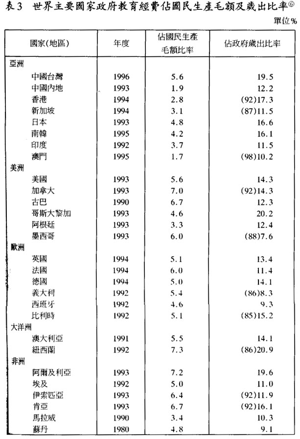 其次,澳門敎育預算在亞洲地區,在全世界都處於低水平(見表3),即使在到了1995年實施七年免費敎育,1997年擴展到十年免費敎育,而且80%的學生獲得享受,但這兩年的敎育經費,還未超過地方總支出的十分之一,這個數字,比中國內地還低!比印度低!比不實行免費敎育的新加坡低!與澳門近年人均生產總値的17,000到18,000美元的水平極不相稱。因此,我們應該明智地看到,敎育界爭取足夠的敎育經費,是爲澳門經濟發展、社會文明進步的明天,並不是爲本界別“爭大份蛋糕”。缺乏這一共識,即使得到充足的公帑,也不保證能發揮其應有的效益來。