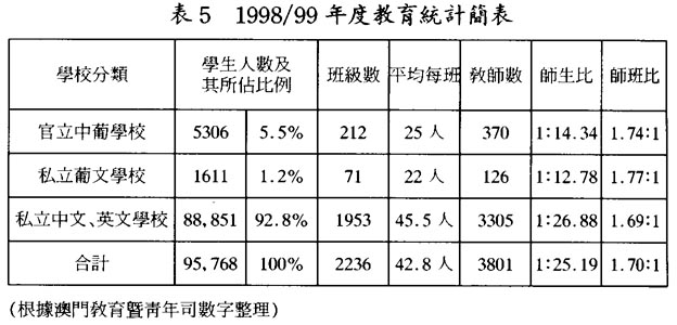 我們可以看到,通過努力,20世紀末澳門敎育可以說基本普及了十年基礎敎育,而其中80%的學生都享有免費敎育。因而工作的重心已經必然地移到質量上來。