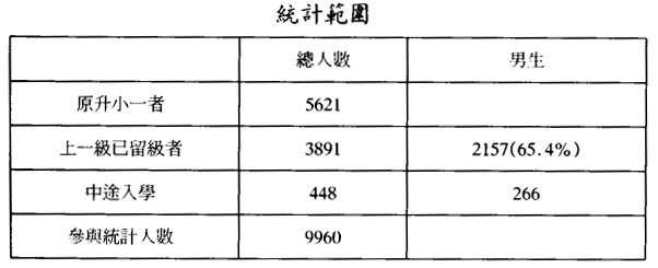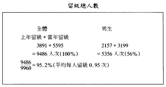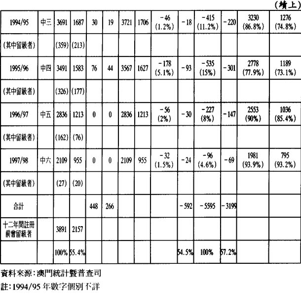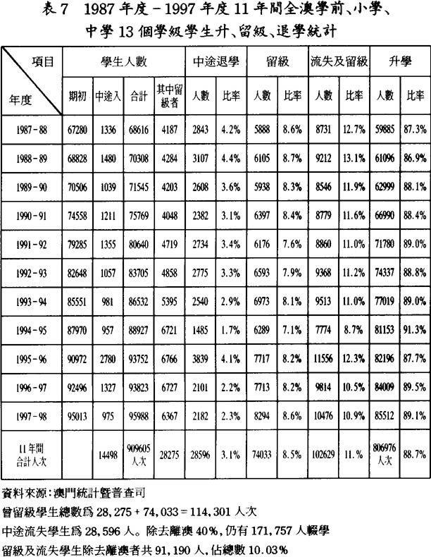 筆者統計了1986/87年入讀全澳小學一年級的學生5621人,一直跟蹤12年,輾轉遞升至高中三年級,即至1997/98年度畢業,加上中途插班的學生共9960人,能完成高中課程畢業的僅1981 人,成功率僅佔19.9%。其中當然有因經濟關係不能升高中,但12年間留級共5591人次,在插入該級前曾留級的已有3891人,合共受留級挫傷心靈共9486人次。每人平均留級0.95次,將近一次,敎育費浪費近1/12。