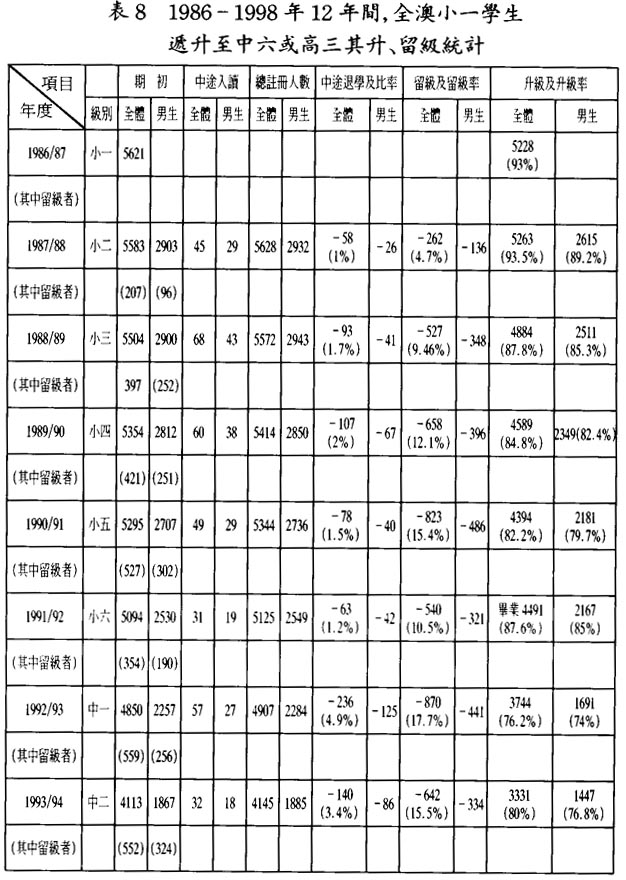 表7顯示,澳門進入過渡期持續11年間,學生升級率最低是1988/89年的86.9%,最高的是1994/95的91.3%,平均升級率爲88.7%,每年中途退學和留級人數不菲,最低1994/95年度的7774人,最高1995/96年度11,556人。據郭慶基的研究,中途退學者約四成離澳,即還有17,157人仍在澳門,在社會上遊蕩,不少成爲邊緣少年,更甚的成爲黑社會的後備軍,今天在街頭的作案者。